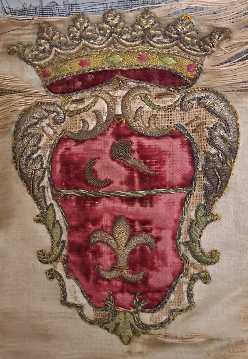 ero iscritto tempo fa nel forum poi mi sono dedicato ad altre ricerche, e quindi mi sono nuovamente iscritto pochi giorni fa. Ringrazio l'amministratore per avermi attivato l'accesso. Sono un ingegnere di 78 anni e mi sto dedicando recentemente alla storia di Santa Giacinta Marescotti e al monastero dove ha passato la sua vita da monaca terziaria francescana di clausura, il monastero di S. Bernardino a Viterbo. Le mie amiche monache, che si stanno occupando del restauro del complesso monumentale e alla sistemazione del notevole archivio del monastero hanno recentemente rinvenuto uno stemma su un paramento sacro di cui allego l'immagine. C'è qualcuno che mi può aiutare a identificare la famiglia di appartenenza o fornirmi informazioni? Grazie in anticipo