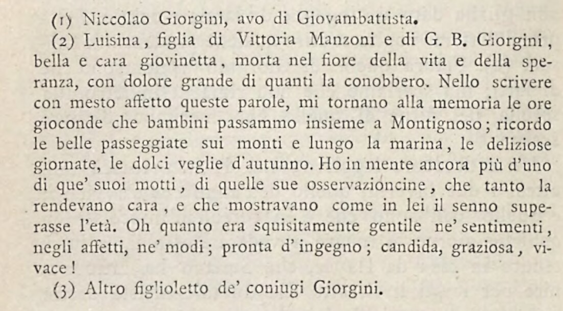 L'editrice di questi brevi ricordi, che è la Signora Matilde Schiff Giorgini, nella bella lettera di dedica al suo illustre padre, il Senatore Giovanni Battista Giorgini, riassume da sè in poche parole, [...]