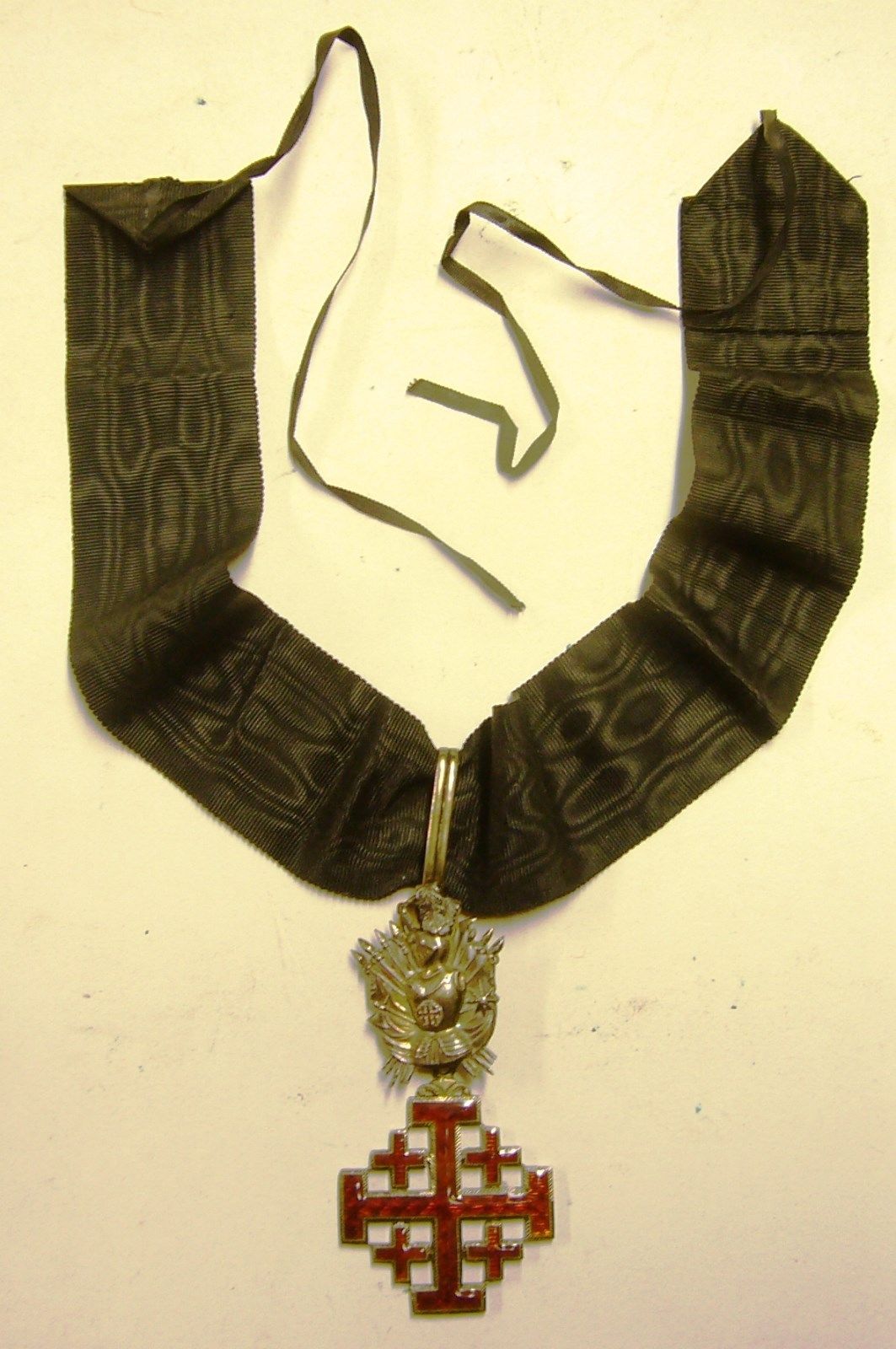 Per i Cavalieri di Gran Croce, Croce di Goffredo di Buglione smaltata di rosso, di cm. 5, sormontata da Trofeo Militare con fascia a tracolla di seta marezzata nera di cm. 10 che si porta dalla spalla destra al fianco sinistro e Placca. La Placca è raggiante d’argento di cm. 8,5, sulla quale e sovrapposta la Croce di Goffredo, smaltata di rosso, di cm. 5. Per i Commendatori con Placca, Croce di Goffredo smaltata di rosso, di cm. 5, sormontata da Trofeo Militare, con Placca. La Placca è uguale a quella prevista per i Cavalieri di Collare, senza l’effige di Cristo Risorgente dal Sepolcro. Per i Commendatori, Croce di Goffredo smaltata di rosso di cm. 5, sormontata da Trofeo Militare; Per i Cavalieri, Croce di Goffredo, smaltata di rosso di cm. 3,5 sormontata da Trofeo Militare.”””