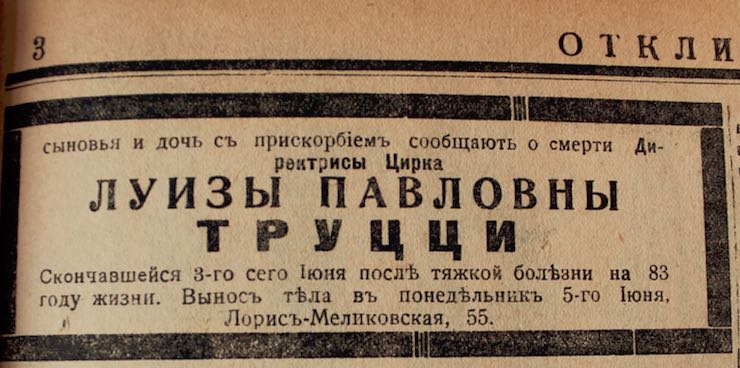 E poi, nel numero successivo del giornale, è apparso un necrologio in una cornice nera sulla morte della direttrice del circo, Louise Pavlovna Truzzi, dopo una grave malattia. [Dipartimento file di amministrazione di Armavir. Gas "Risposte dal Caucaso" n. 121 del 4 giugno 1917, p. 3.] A giudicare dalle pubblicità, gli spettacoli continuarono per diversi giorni, ma presto il circo lasciò Armavir.