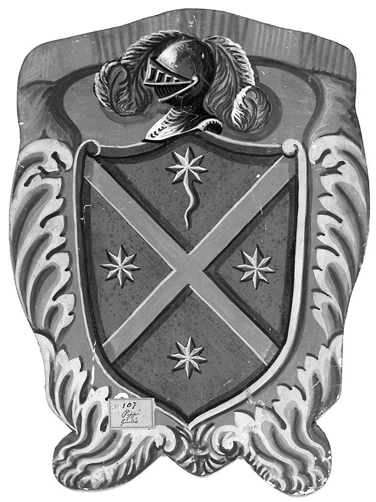 gentilizio - Stemma - Pippi - scudo sannitico sormontato da elmo piumato. Blasonatura: d'azzurro alla croce di Sant'Andrea di rosso accompagnata da una cometa montante in palo d'oro posta in capo e di tre stelle a otto punte d'oro