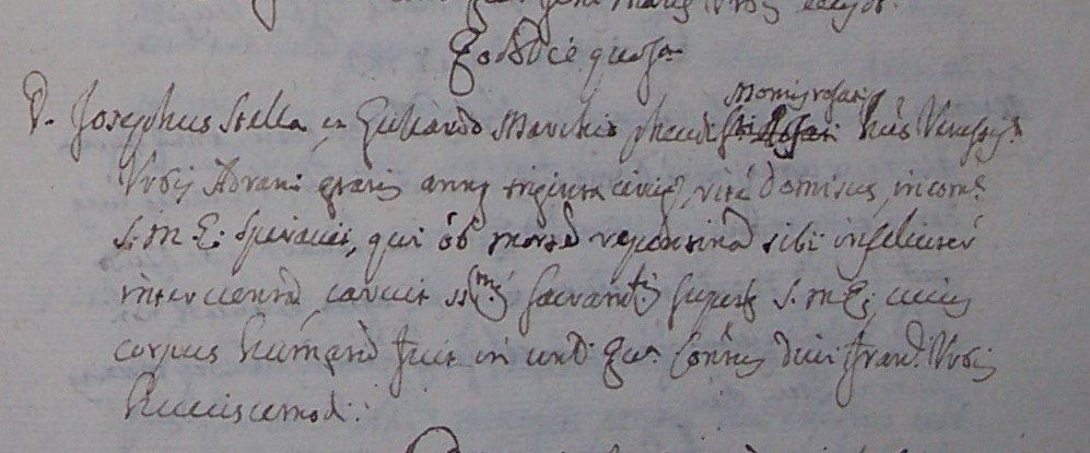 allego la riproduzione fotografica dell'atto di morte del marchese di Monterosato don Giuseppe Stella e Guzzardi, defunto in Adrano a 30 anni nel 1769. Per inciso, ricor-