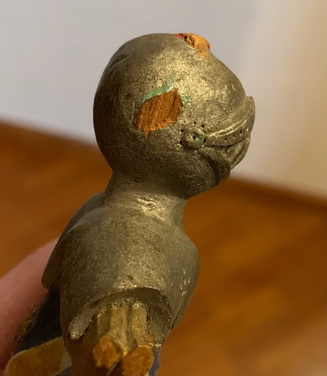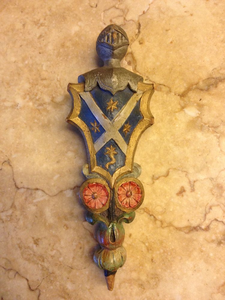 approfitterei nuovamente della Vostra disponibilità e competenza per un altro quesito. Quella in foto è una riproduzione in legno dello stemma della mia famiglia che, come mi è stato raccontato, si trovava in una composizione floreale utilizzata in occasione di un matrimonio. Dovrebbe risalire alla metà del 1800, forse seconda metà. Mi chiedevo se l'elmo sopra lo stemma (alla sua sommità ed ai due lati ci sono dei segni che lasciano intuire che doveva esserci attaccato qualcosa) fosse soltanto un ornamento generico, standard per l'epoca, oppure se la sua forma e posizione potessero avere un significato particolare.