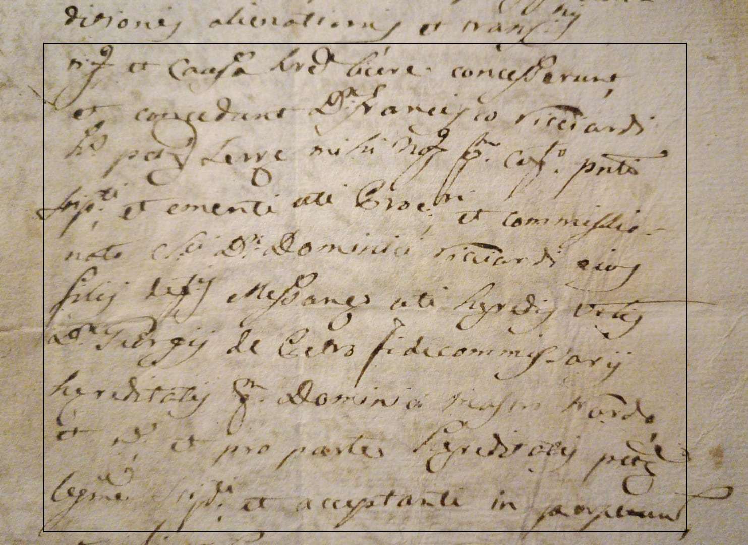 ... concessero e concedono a D. Francesco Ricciardi di questa predetta Terra, conosciuto da me notaio, presente, stipulante e acquirente in qualità di procuratore e incaricato di suo figlio Sac. D. Domenico Ricciardi vivente a Messina erede universale di D. Giorgio Di Pietro fidecommissario dell'eredità del fu Domenico Mastronardo e in nome e per parte dell'eredità predetta legittimamente stipulante e accettante in perpetuo ...