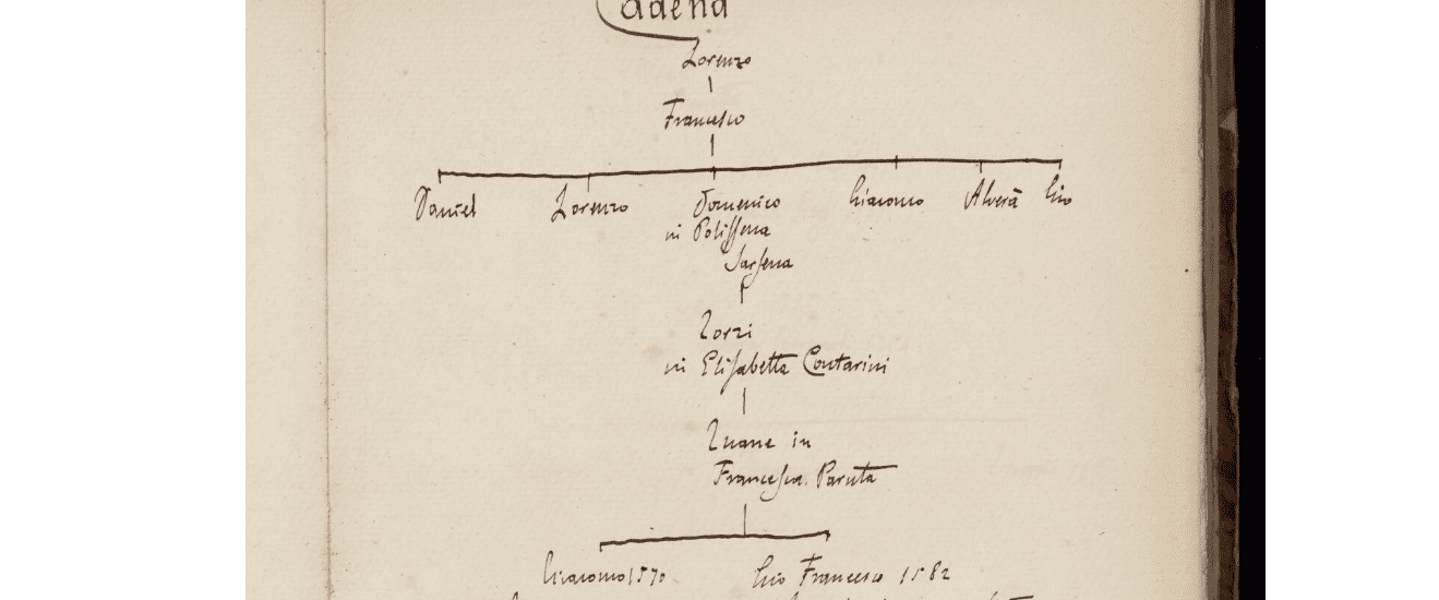 Ciò che però più mi interessa in questo contesto riguarda l’ascendenza di Gaspare Cadena. Egli è indicato come figlio di Nicolau Cadena e di Laura Lini, cittadini della città di Venezia. Nicolau risulta a sua volta figlio di Pietro Cadena e di Fabia Contarini, anch’essi veneziani.