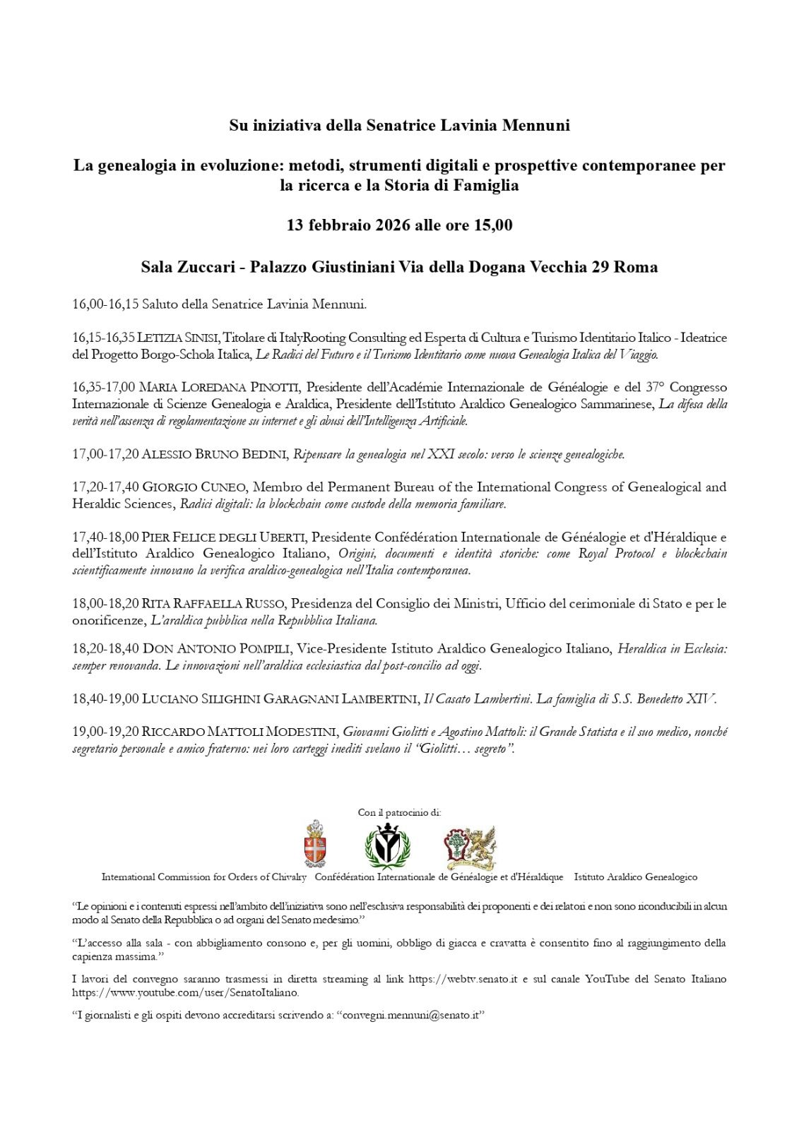Il 13 febbraio 2026, alle ore 15.00, la Sala Zuccari di Palazzo Giustiniani, in Via della Dogana Vecchia 29 a Roma, ospiterà il convegno “La genealogia in evoluzione: metodi, strumenti digitali e prospettive contemporanee per la ricerca e la Storia di Famiglia”, promosso su iniziativa della senatrice Lavinia Mennuni. L’incontro si colloca nell’ambito delle attività ospitate dal Senato della Repubblica e si propone come momento di confronto sui temi della genealogia, dell’araldica, del diritto nobiliare e delle nuove tecnologie applicate alla ricerca storica di famiglia.