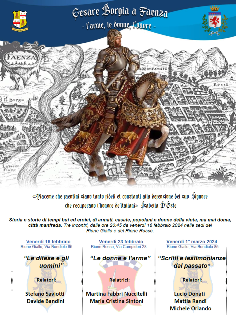 Segnalo per tre venerdì - oggi 16 febbraio, il 23 e il 1° marzo - gli incontri sul tema “Cesare Borgia a Faenza: l'arme, le donne, l'onore”: