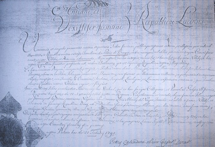 Il documento che avevo postato tempo fa e in calce al Libro d egli Anziani dove è riportata la Patente, mi sembra chiaro in tal senso. Se non fosse leggibile, riporto di seguito la trascrizione: “Anziani. Facciamo piena ed indubitata fede a chiunque perverranno le presenti nostre qualmente tutti quelli che intervengono in Senato, o che godono la Suprema dignità dell’Anzianato sono Nobili e Patrizi della Repubblica nostra, non godendo dell’onore d’intervenire in Senato, ne la dignità e Magistratura della Repubblica, se non i Nobili Patrizi della stessa Repubblica. In fede 2 maggio 1790.” Infatti nel Regno di Napoli, conservavano il riconoscimento di Patrizi Lucchesi, cioè di un titolo Nobiliare "foresto" grazie al Recipiatur della Camera di santa Chiara di Napoli. E poi il libro d'oro della Nobiltà di Lucca, il secondo citato, è del 1787, non del 1797. Pertanto il documento essendo del 1790, il provvedimento cade tre anni dopo la pubblicazione del suddetto Libro d'oro che in tal senso non poteva essere aggiornato e soprattutto 9 anni prima la caduta dell'antica Repubblica Lucense (1799), quale Stato sovrano e fons honorum.