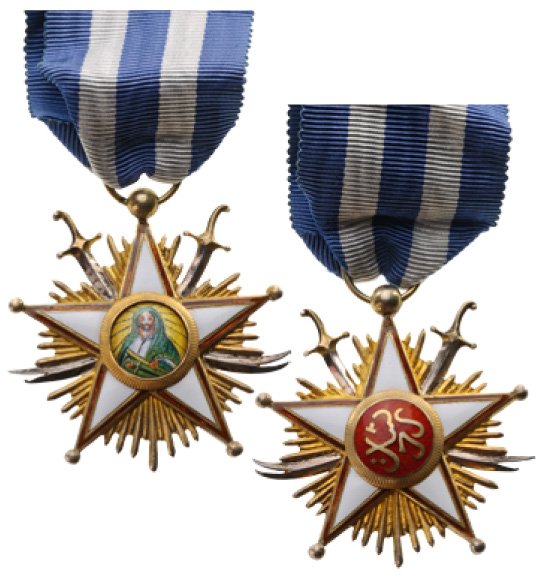 Comunque la decorazione dovrebbe essere il così detto "ordine dei leoni" : ovvero, dovrebbe essere, il riconoscimento concesso ai negoziatori persiani che trattarono con gli afgani la cessione della valle del Panjshir (lett. Valle dei 5 leoni); i cinque leoni che compaiono tra le punte della stella vorrebbero appunto ricordare ciò, mentre il centro, forse in oro, rappresenta (molto stilizzato) un sole nascente (o tramontante) . Non sono sicuro della data (1854?), comunque credo sia abbastanza raro, poichè ho visto una sola volta una foto di analoga decorazione.
