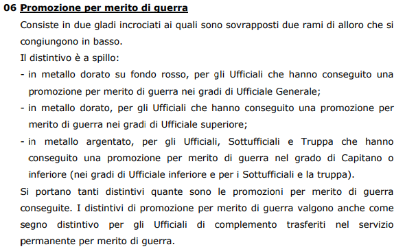 Di sotto l'estratto del regolamento delle uniformi dell'esercito... oh che strano il distintivo per encomio solenne è uguale a quello della promozione per merito di guerra ad ufficiale superiore... che strana coincidenza!