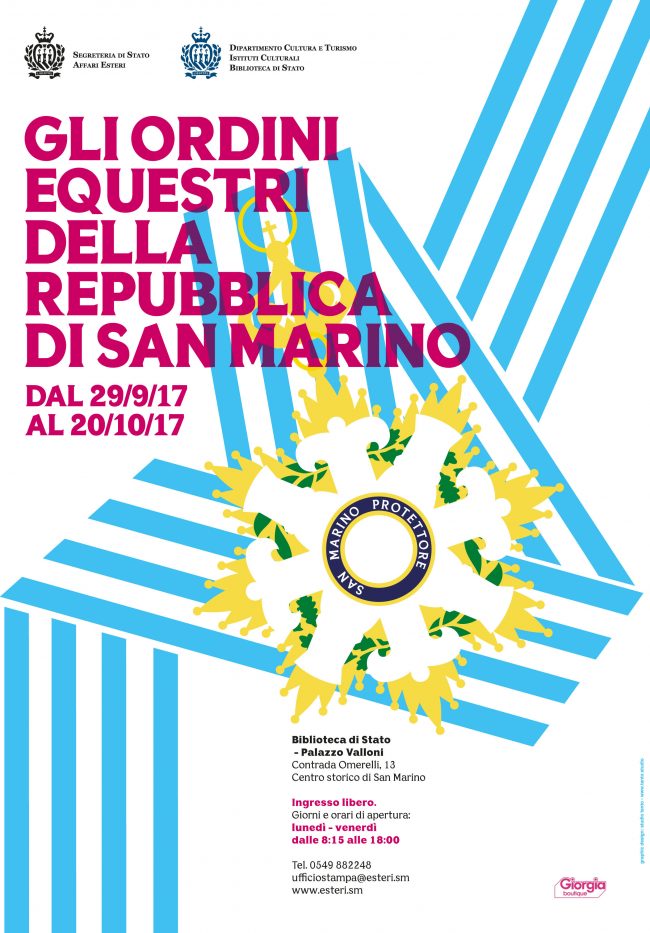 " Venerdì 29 settembre, alle ore 17.30, alla presenza dei Capitani Reggenti della Repubblica di San Marino, si è tenuta l’inaugurazione della mostra sugli Ordini Equestri, allestita a Palazzo Valloni, sede dalla Biblioteca di Stato, patrocinata dalla Segreteria di Stato per gli Affari Esteri, in collaborazione con gli Istituti Culturali.