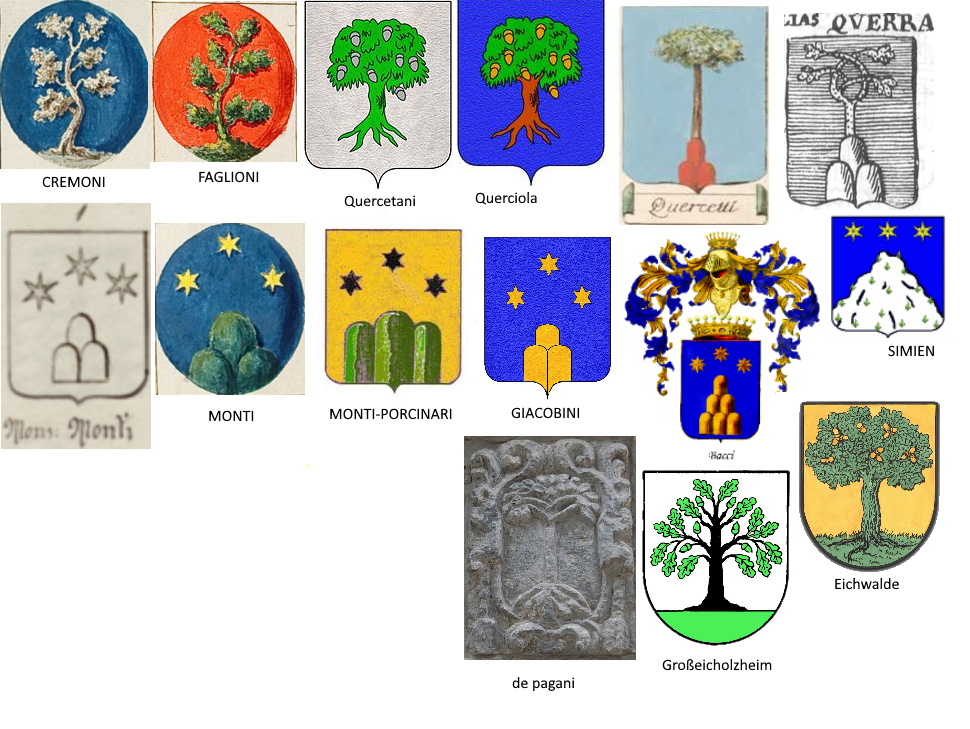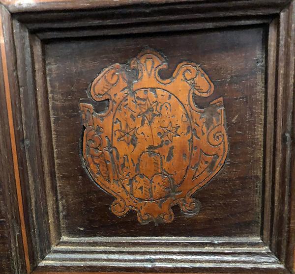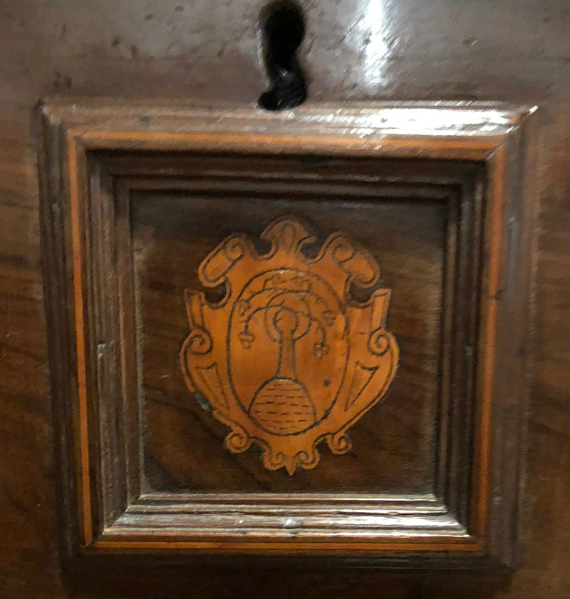 gli stemmi riprodotti si presentano sul davanti e sul retro del mobile, in uno si possono riconoscere con certezza 3 colline e 3 stelle, mentre nell'altro qualcosa che io, da profano, ho associato ad una tiara papale e forse una colonna con motivo che riporta delle ghiande.
