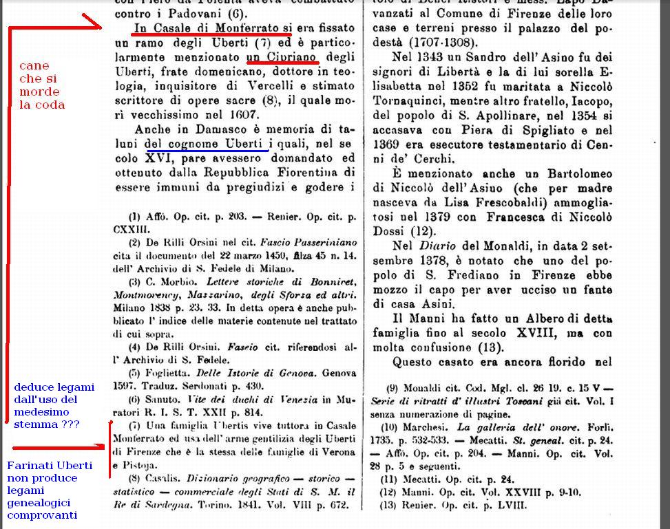 Mi dica dove è la prova che Ottone e 12 baroni sono andati a Fiesole? Il documento? Ma al tempo stesso è vero che in quell’epoca vi erano i discendenti dei barbari e fra i Goti e Vandali vi erano vari membri che erano Sassoni… Lei avrebbe dovuto conoscere il mio modo di pensare e il mio rigore scientifico, prima di tacciarmi di pura credulità nelle leggende. Sono il primo a dire che non esiste una prova scientifica che dimostri la discendenza dei de Ubertis da quelli fuoriusciti da Firenze, ma al massimo vari indizi (Giovanni degli Uberti combattente per i Visconti, vi fu uno scontro in Monferrato; il Monferrato terra dei fuoriusciti ghibellini, l’uso nei primi documenti del XV secolo del termine fuoriusciti, e moltissimo altro ma ripeto un indizio per me non è certo una prova. Tuttavia lo stesso modo di pensare l’adotto per tutte le genealogie. Quindi l’attribuirmi che io credo alla leggenda del Villani lede la mia credibilità di studioso!!!