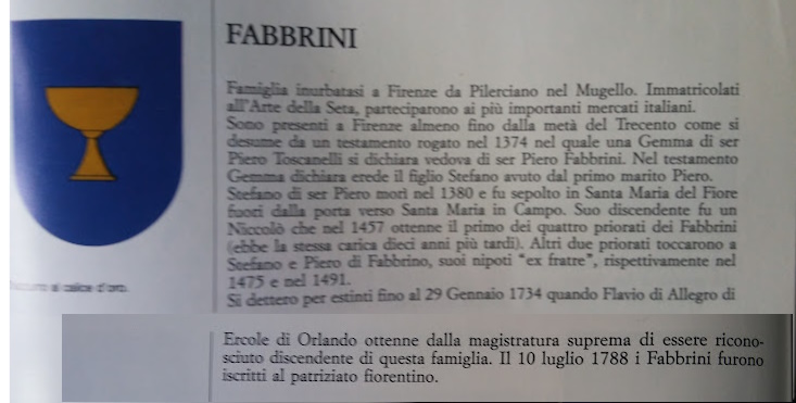 Buonasera Luca , ben trovato , un vero piacere , probabilmente abbiamo stesse lontanissime origini e parentele , la famiglia è antichissima ma ha tantissimi rami . Posseggo un libro che cita Scipione Fabbrini famoso avvocato grossetano del XIX secolo...non fa parte dei Fabbrini dal Lion bianco , ramo a cui appartengo , del quale ho genealogia certa a partire dal tardo 400 , l'ho acquistato in edicola ad Arcidosso , Grosseto , e parla di illustri personaggo dell'Amiata . Il mio ramo è rimasto a Firenze dal 1400 al 1850 circa , ma ne avrà letto la storia , proprio in questi giorni una genealogista sta indagando presso l'archivio di Firenze per confrontare la mia documentazione con i fascicoli colà esistenti cui essa fa riferimento . Tenga presente che il mio stemma è identico ad altro dei Fabbrini , degli aranci , tranne che per le scuri , che nel mio sono al naturale , ovvero hanno impugnatura color legno e lama argentea , mentre i degli aranci hanno le scuri completamente dorate . Spero di esserle stato utile . A presto .