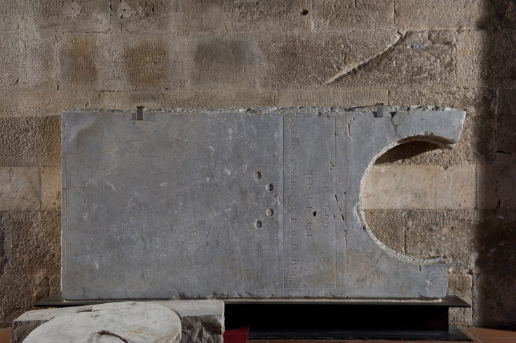 Lastra tombale in marmo grigio. Nella parte superiore, iscrizione incisa in stato frammentario e quasi illeggibile, risalente con probabilità al XVII secolo. Al centro, entro cornice lineare rettangolare, iscrizione ben conservata datata 1846. Nella parte inferiore mancanza di un frammmento a profilo rotondo.