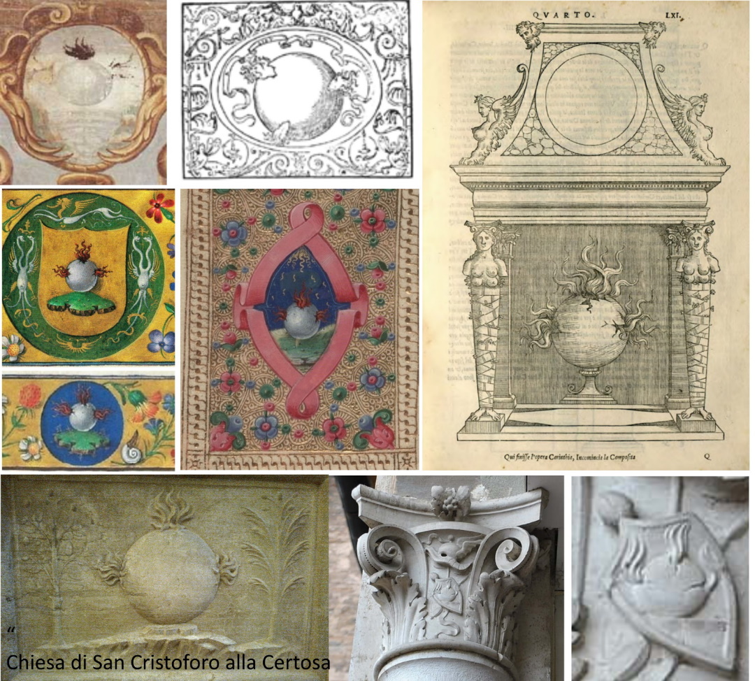 particolare che si ripete anche nell’emblematica estense, sia nella borsiana “bacinella con le fiamme”, che nella “granata fiammeggiante” di Alfonso I.
