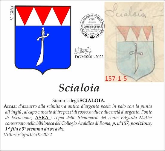 Arma: d’azzurro alla scimitarra antica d’argento posta in palo con la punta all’ingiù ; al capo cuneato di tre pezzi di rosso su due e due metà d'argento. Fonte di Estrazione, ASRA : copia dello Stemmario del conte Edgardo Mattei conservato nella biblioteca del Collegio Araldico di Roma, p. n°157, posizione, 1^ fila e 5° stemma da sx a dx.