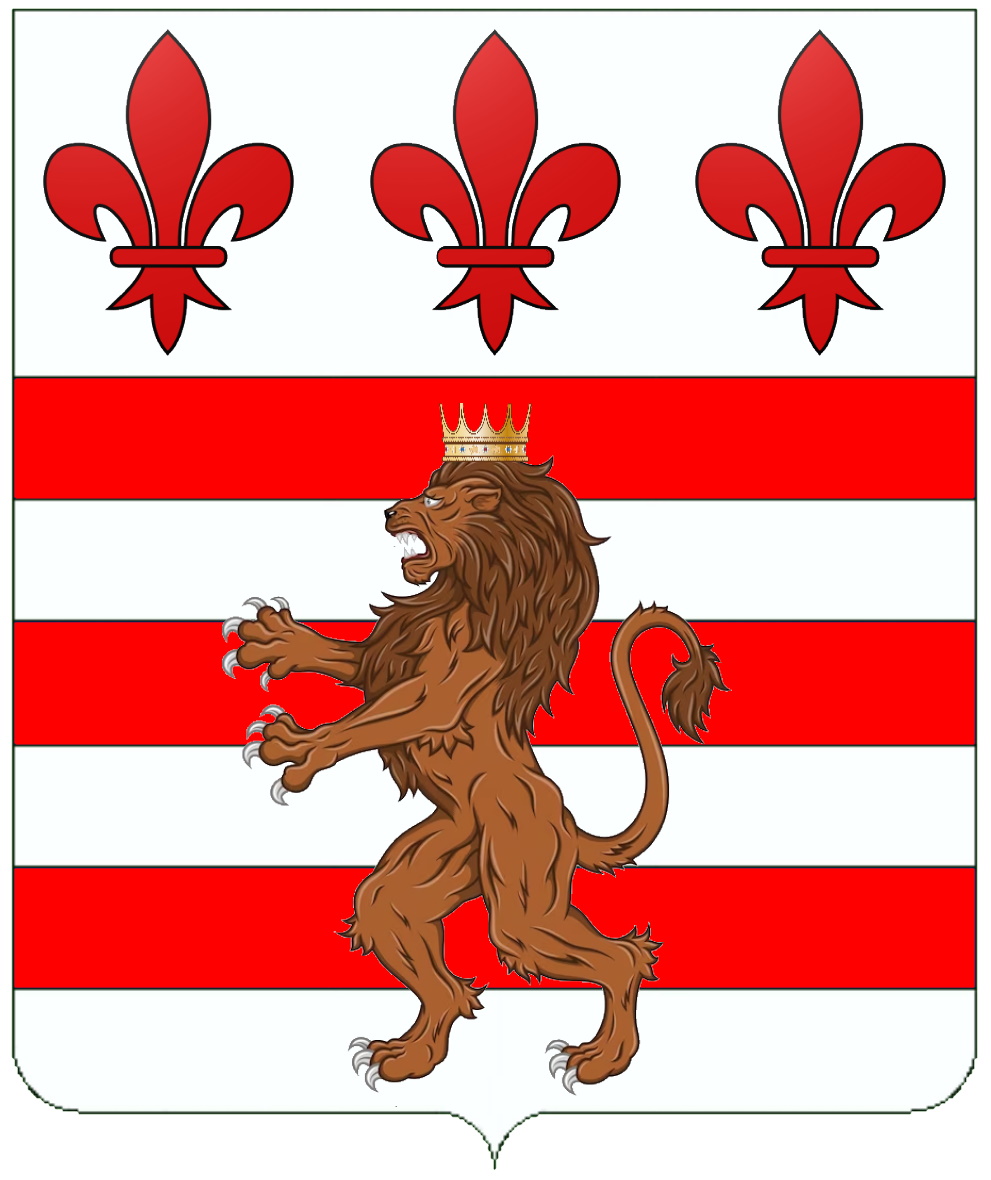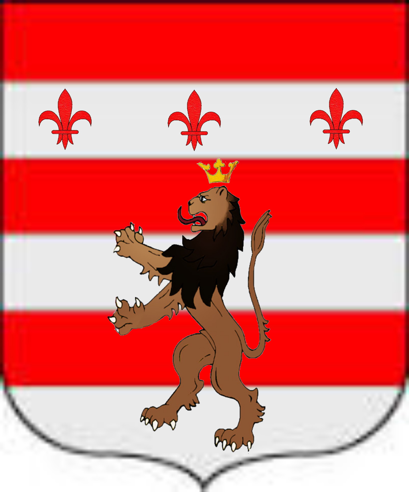 Fasciato di sei pezzi di rosso e d'argento, al leone attraversante al naturale, coronato d'oro; e al capo del secondo, caricato di tre gigli del primo.