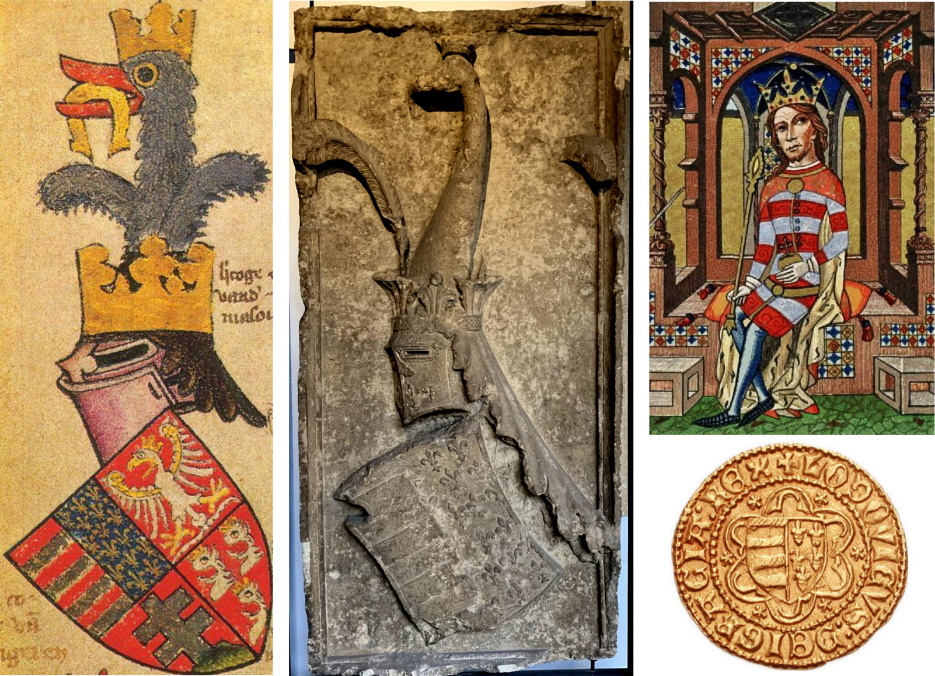 Ora, nell'esemplare del Gerle vi sono, in aggiunta altri tre quarti relativi agli altri domini di Luigi d'Angio' - che fu anche re di Polonia -, ma appare straordianaria la comunanza tra i due emblemi così che è difficile dubitare della loro correlazione grafica.