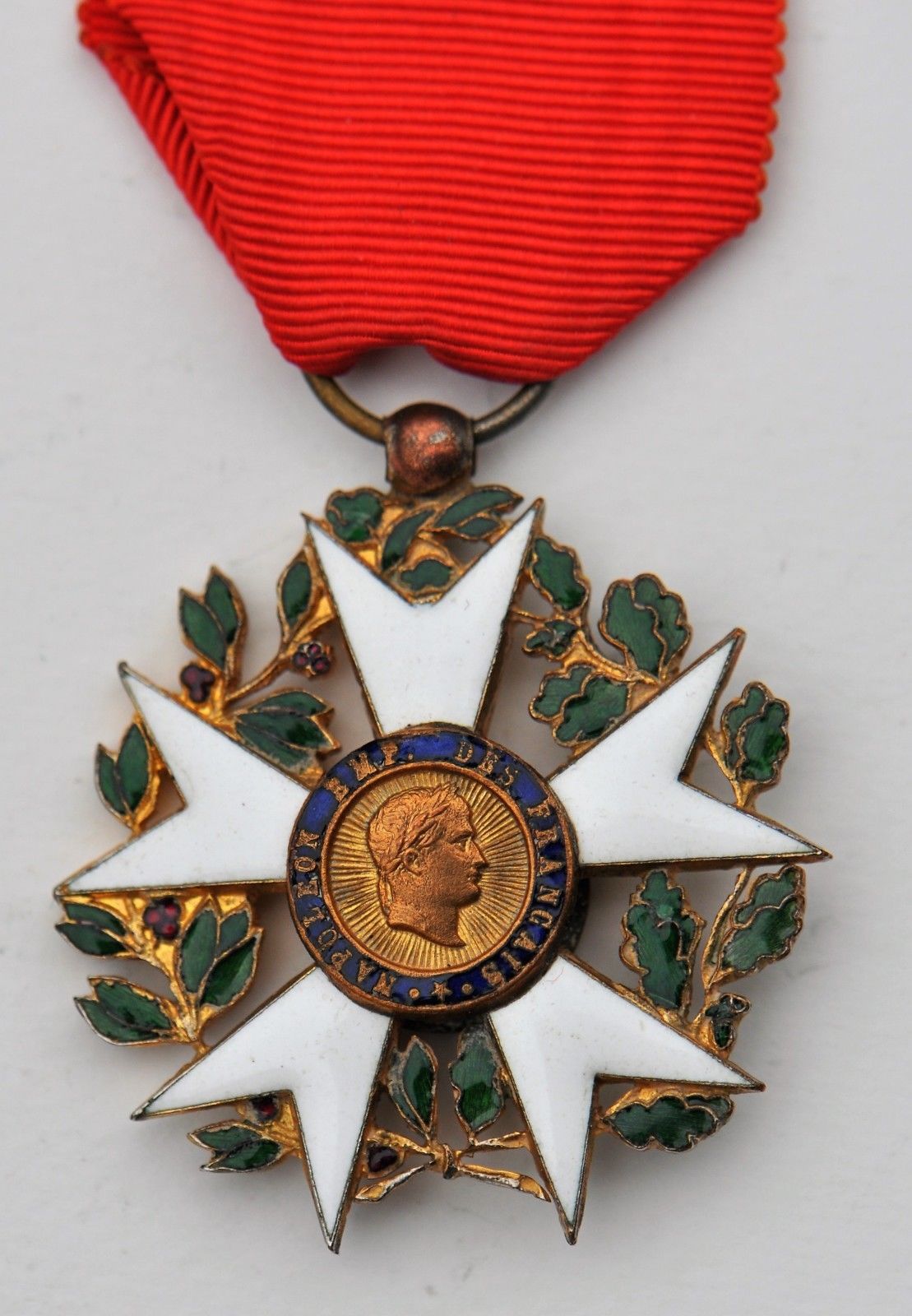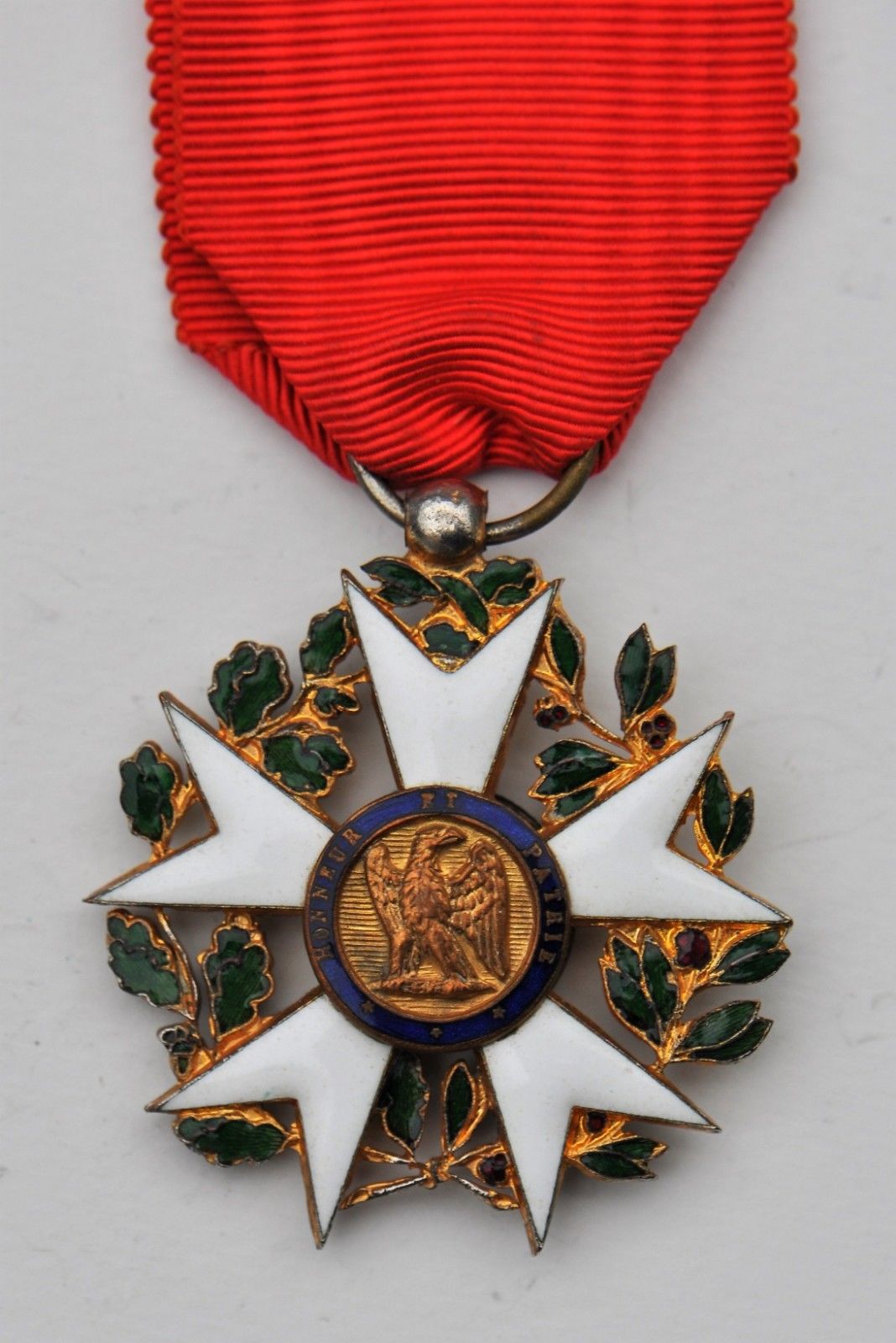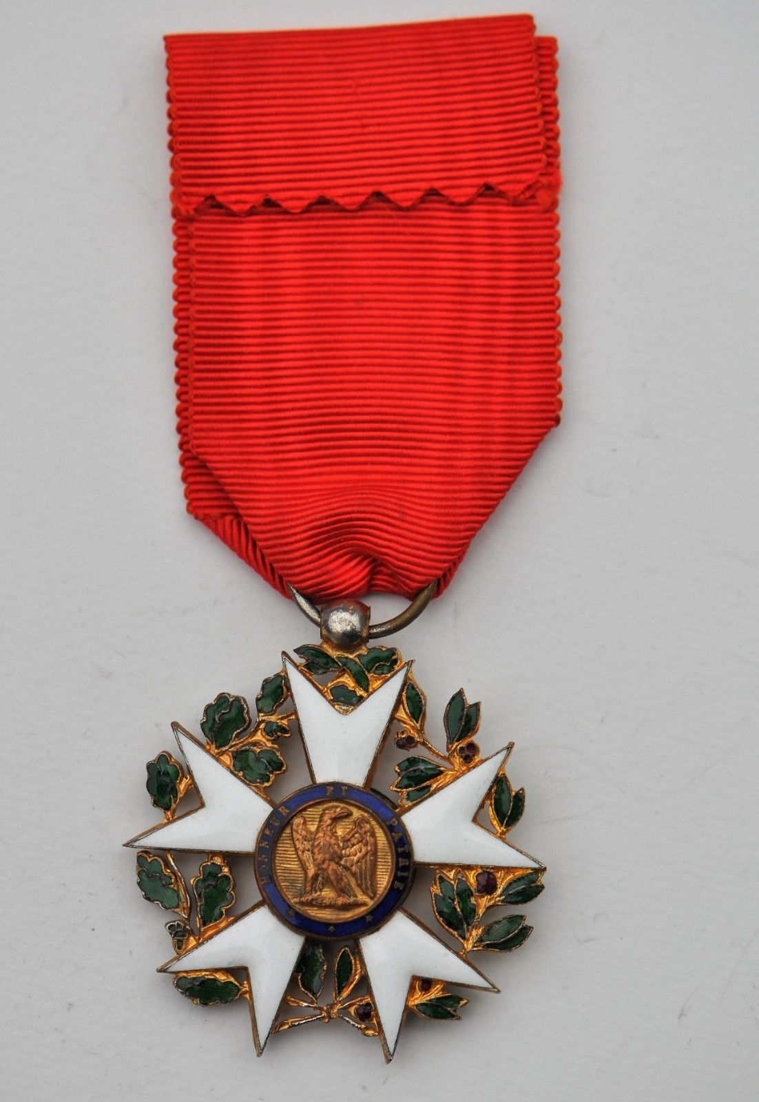 La couronne de chêne et de laurier entièrement visible (usures et éclats). Bélière boule, anneau lisse. Ruban à bouffette d’époque.