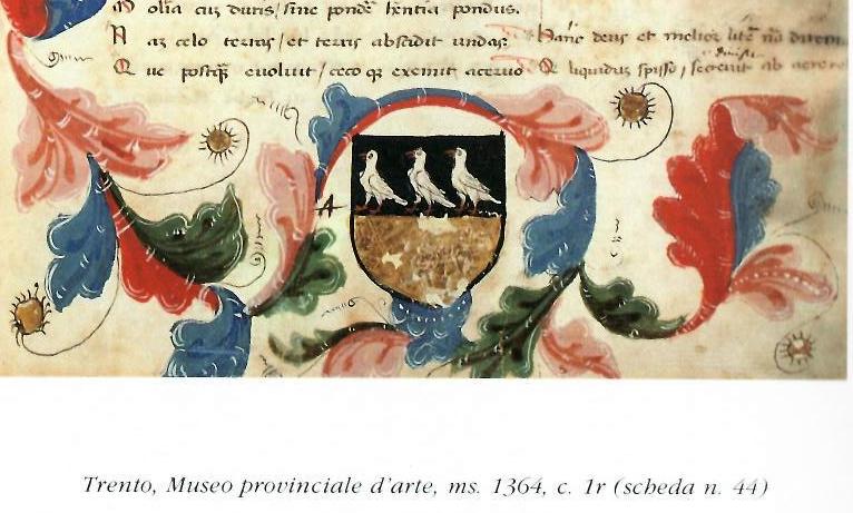 Troncato: nel 1° di nero, a 3 colombe d’argento imbeccate e membrate di rosso; nel 2° d’oro (ms 1364)