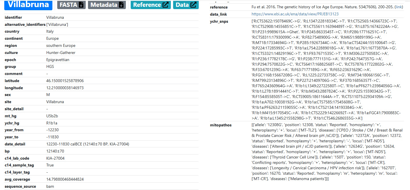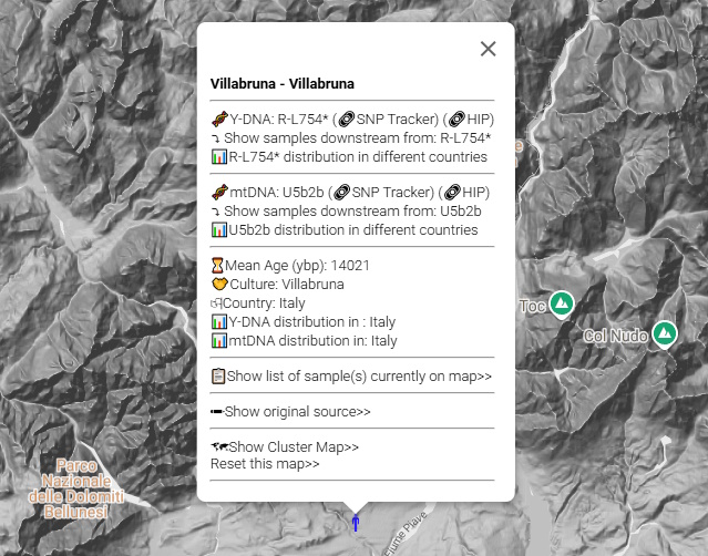 L'Aplogruppo R1b1 è stato trovato a Villabruna (Provincia di Belluno) in un campione di circa 14000 anni fa.
