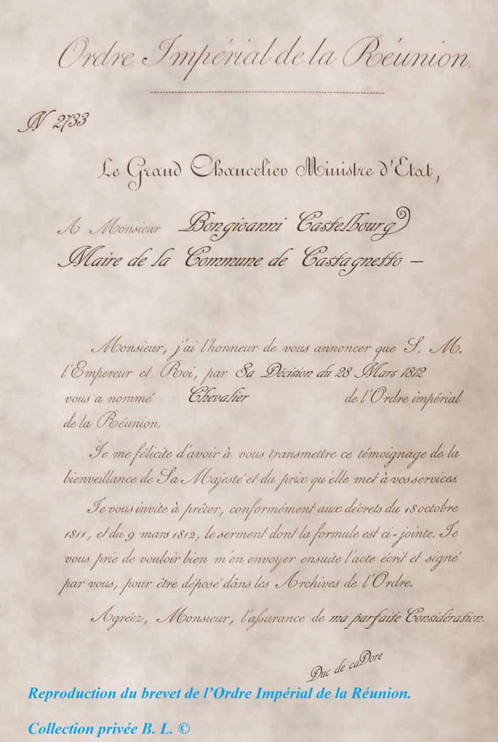 Le document est-il bien en rapport avec l’entête au nom du général Luigi Bongiovanni di castelborgo, et son brevet sur l’Ordre Impérial de la Réunion, alors maire de Castagnetto ?